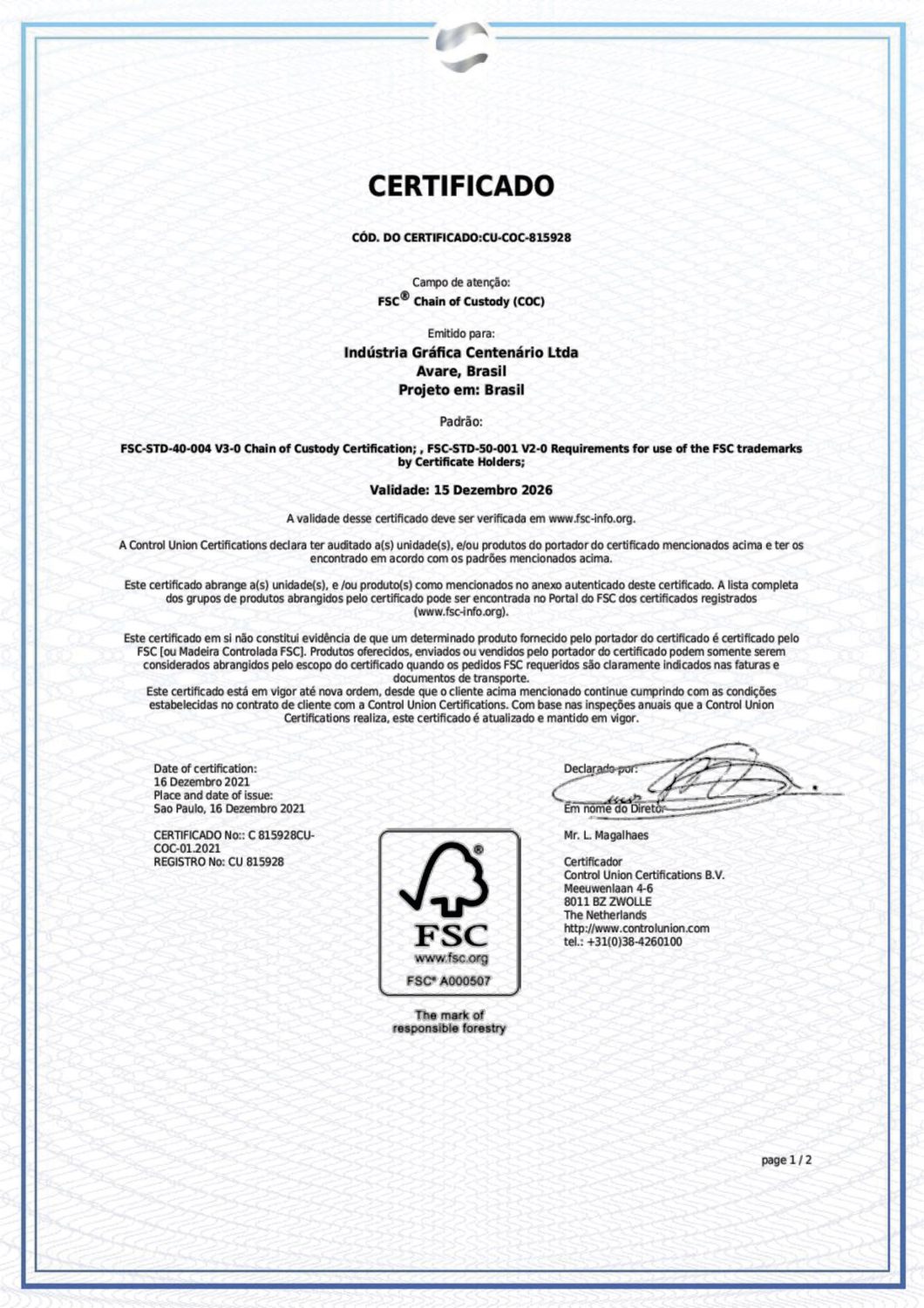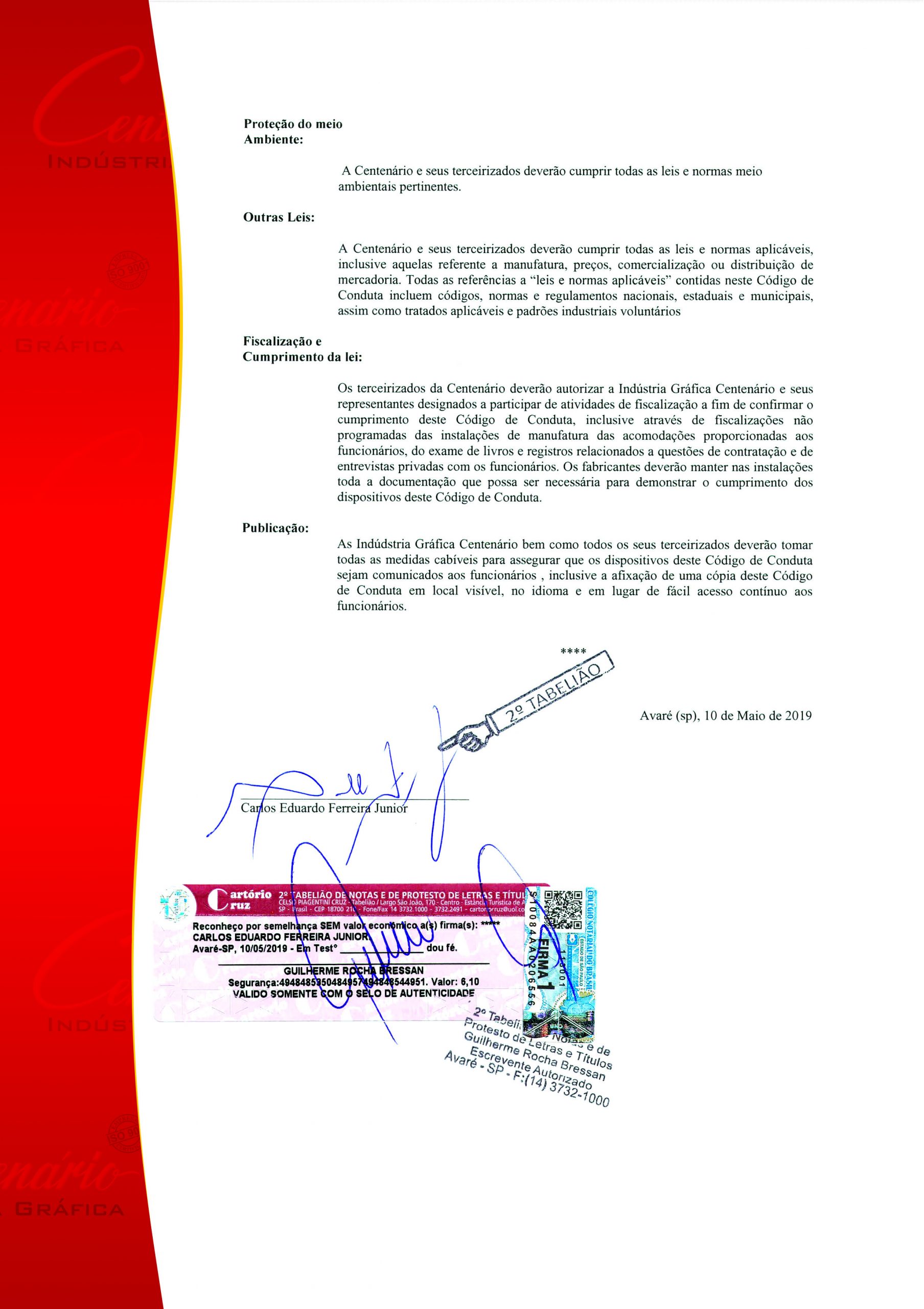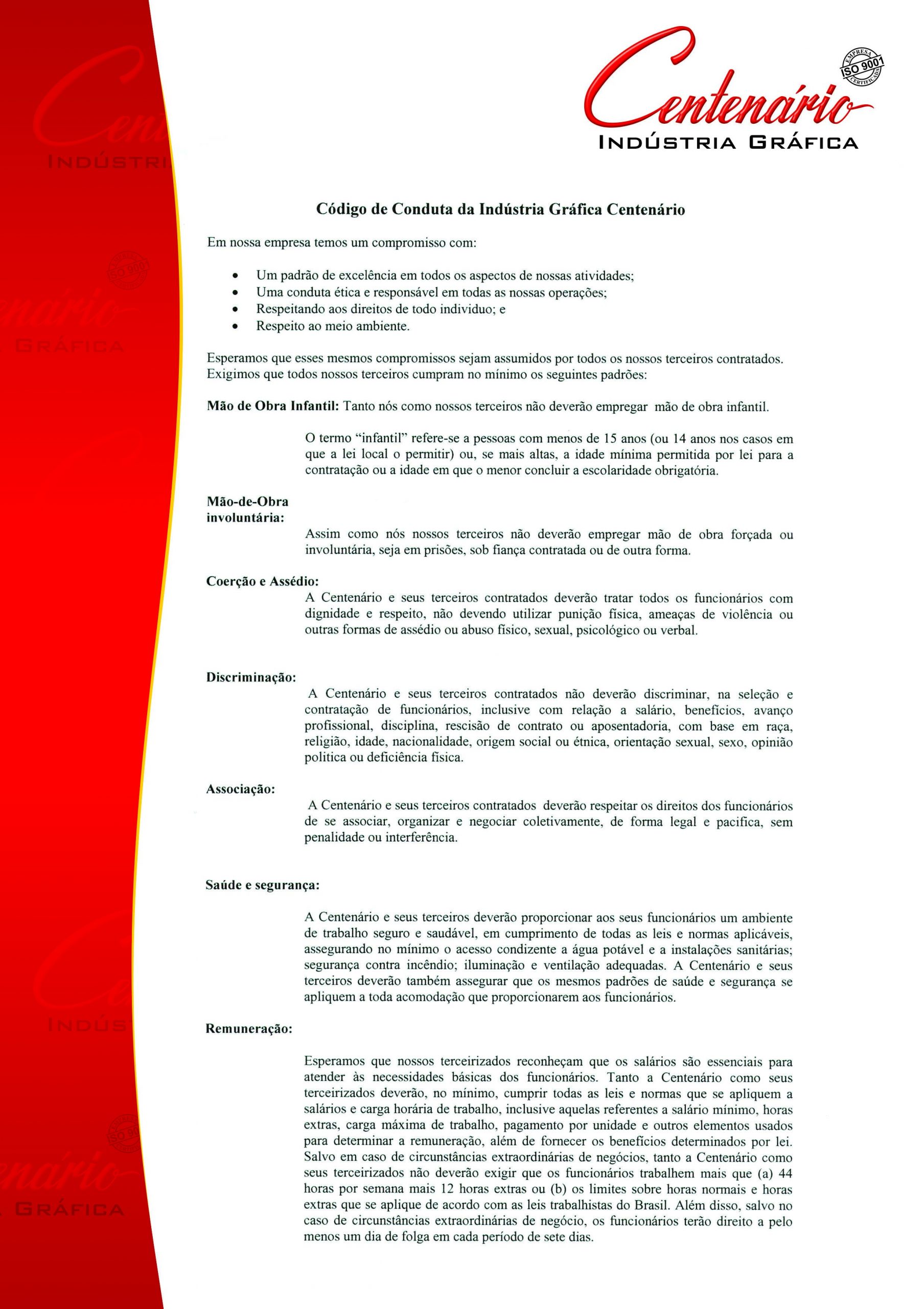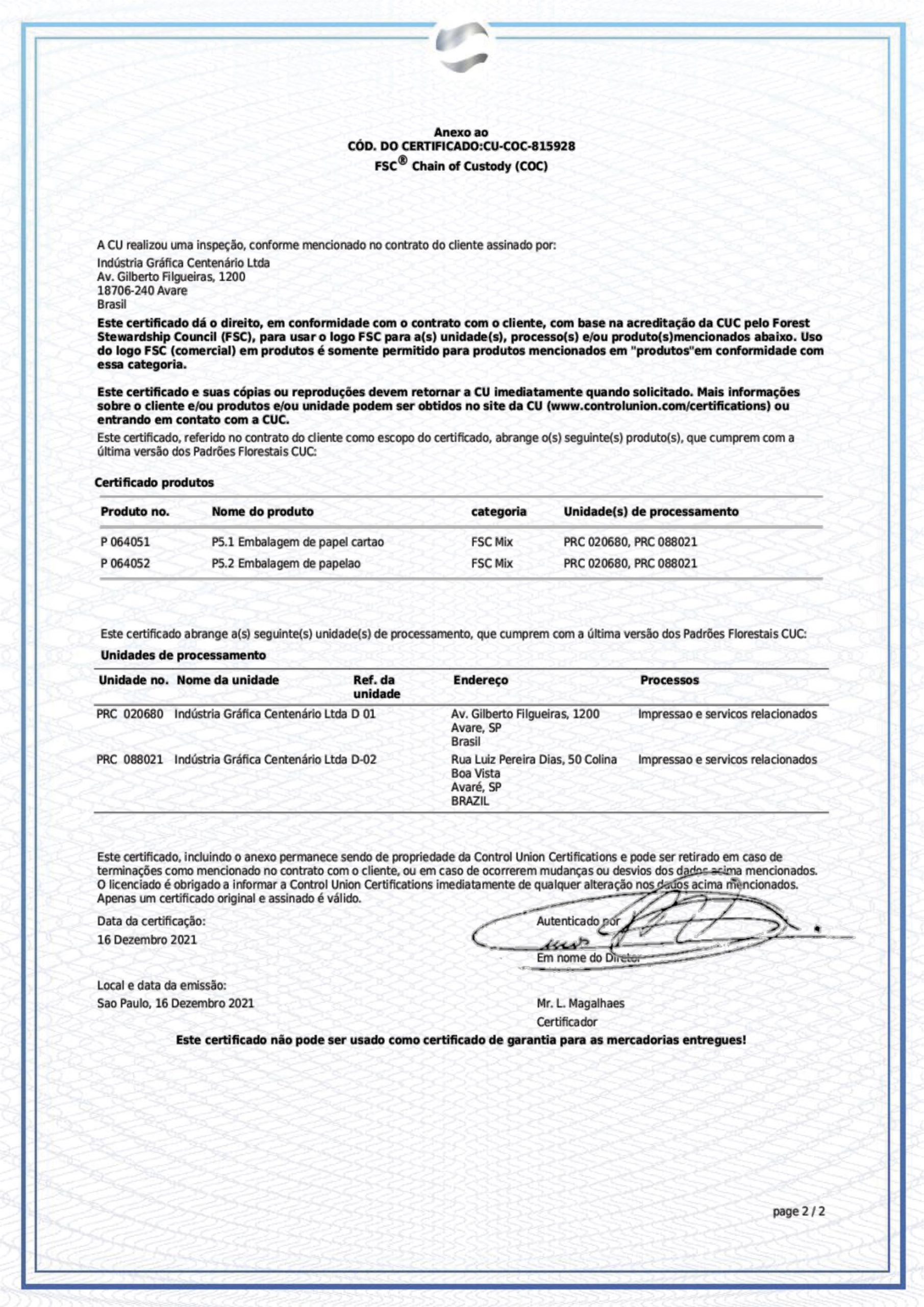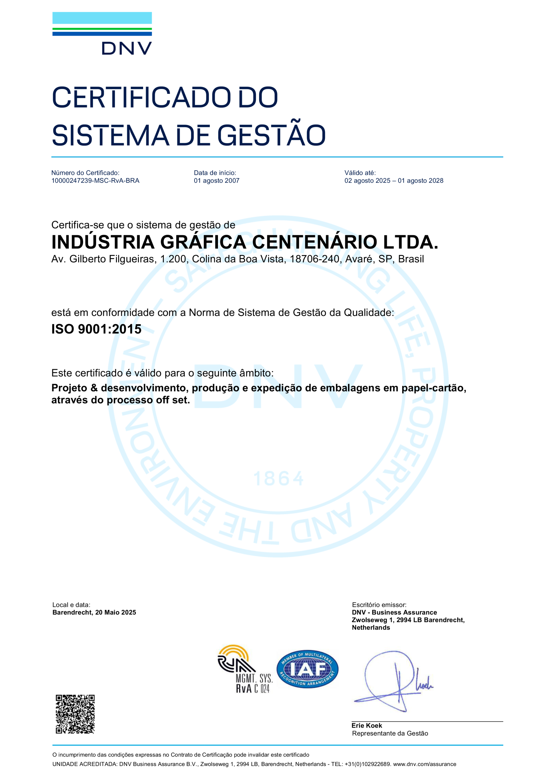 A Centenário é uma empresa de capital nacional, fornecendo embalagens adequadas a todos os segmentos da indústria nacional, e vem se desenvolvendo na busca de qualidade, investindo constantemente na sua área de atuação: impressão offset, impressão flexográfica, laminação, corte e vinco e coladeiras. Com representantes espalhados em todo o território brasileiro, facilitando sobremaneira a distribuição e comercialização de seus produtos. Dispõe de um Departamento de Criação e Desenvolvimento em condições de elaborar a sua ideia com critério, criatividade e funcionalidade, buscando uma verdadeira e autêntica parceria, com um atendimento ágil, pontual e de qualidade. Em vista disso, adotar a Centenário como fornecedor de suas embalagens será a opção de ter um atendimento comprovadamente diferenciado.